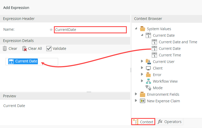 then drag the Current Date value from the Context Browser > System Values > Current Date options. Click OK.