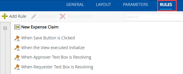 Rules consist of events, conditions and actions. A valid rule contains at least one action.The Requester control displays the user's display name after it has searched for and resolved the query input. In other words, you can type in a few characters, click the search icon and the results of its search are resolved (returned) . In your case, you want to provide a default value (the current user's display name) as a convenience. To return a default value, you need to provide a parameter to be used in the search. You want to return the current user's display name, so you configure the parameter to search for a value that returns the current user. To do this, you configure the action with some contextual information. Contextual content is a variable (found in the Context Browser). The variable is replaced with "live" data at runtime. This particular control searches for users by display name, email, or user name. Because email addresses are unique, you configure the action to search for the current user's email, then return the display name as the control's default value. - Next, you add a rule that sets the Requester value to the current user. Users can submit expense claims for others, for example, a manager's assistant submitting a claim for the manager. Most of the time, the user is likely submitting a claim for themselves. So, for convenience, you prepopulate the Requester control with the current user's name. When the view loads, the current logged-in user's credentials are retrieved. This rule retrieves the email credential, then searches Activity Directory for that email. Finally, it returns the user's full name, based on the email filter. Click the RULES tab.
