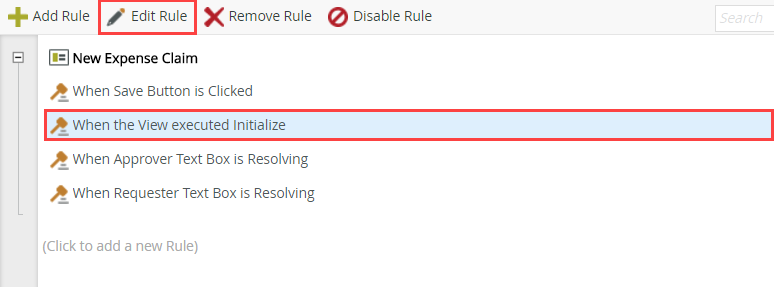 - Select the When the View executed Initialize rule, then click the Edit Rule button.
