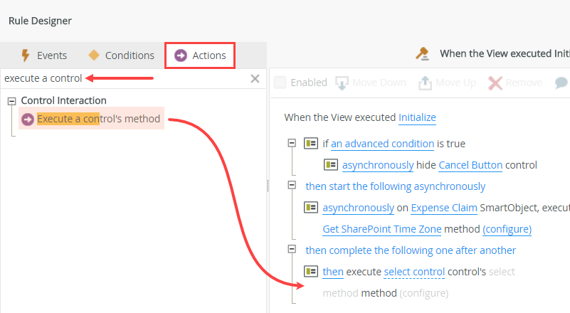 Search results are returned as you type. Click Execute a control’s method to add it to the list of actions in the rule definition pane on the right-hand side.