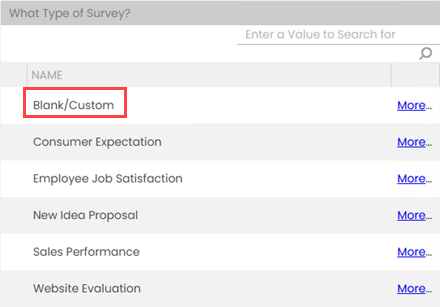 - Blank/Custom: Define your own questions. This option allows you to build your survey questions from scratch.