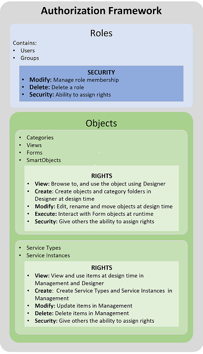 On a high level, you can think of the authorization framework as a collection of Roles (people) that have certain rights on Objects (Categories, Views, Forms, SmartObjects) and Service Types and Service Instances in an environment. You can control access to different roles by configuring security on a role, and control access to objects, Service Types, and Service Instances by assigning rights to a role to interact with objects, Service Types, and Service Instances. Permissions are used to define explicit authorization, and inheritance/overrides.