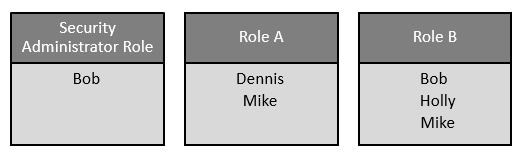 | Form | Role B | View Deny | Bob can see the Form even though he is a member of Role B which has Deny rights. This is because Bob belongs to Security Administrators role that has rights to all objects. |