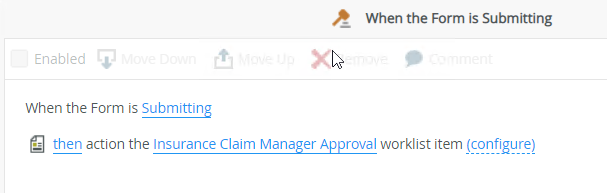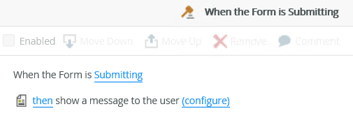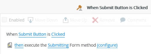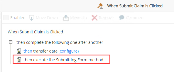 - When you use an event such as a button click to execute the Execute the Submitting Form method action, and the rule contains more actions, the Execute the Submitting Form method action must be the last item in the statement because it triggers the When the Form is Submitting event.