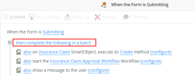 - When you use the When the Form is Submitting event, you must batch rule actions together using the complete the following in a batch execution type because only one call is made to the server when you submit the draft. The following image shows an example of a batch execution.