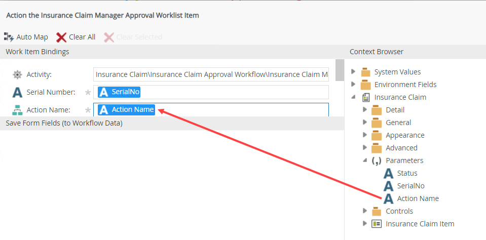 - If you want to action a form in a workflow task from the Drafts folder in the Workspace (Mobile) apps, it is recommended that you use a form parameter to set the Action Name field of the Action a worklist item rule action. The following images show an example of how you can create and configure this rule.