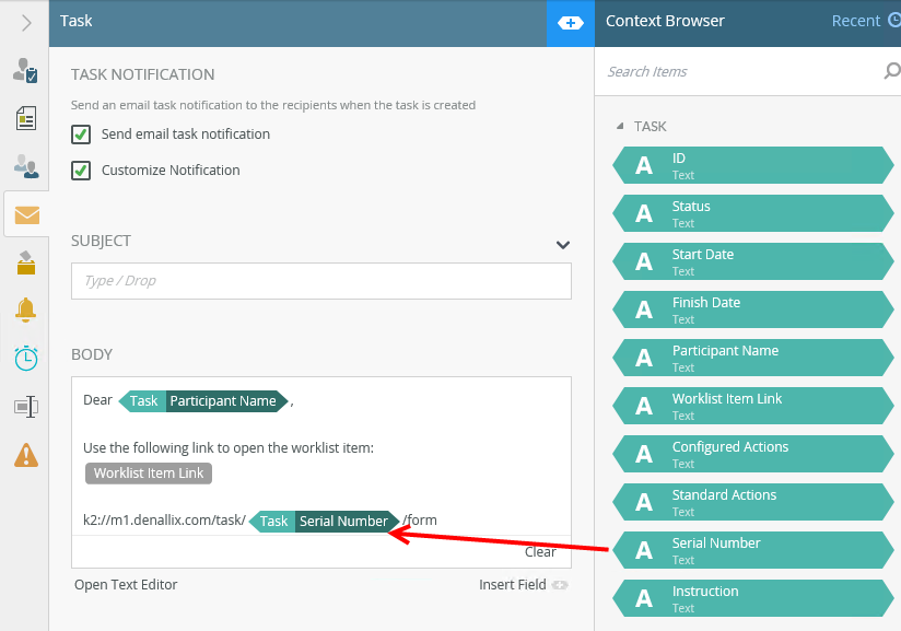 If you build the deep link as part of a customized email notification within a workflow, you need to manually type in the URI, but you can drag the task serial number for a task or application form from the context browser, as shown in the following image: