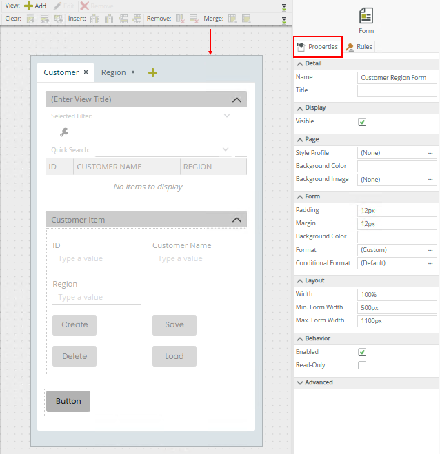 When you work with a view on a form, you can configure the view's properties on the form. Click the view to open the view's properties.