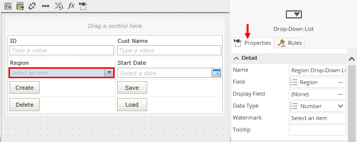 The Properties tab contains properties for a control, view, or form that you can use to change how they look and behave.