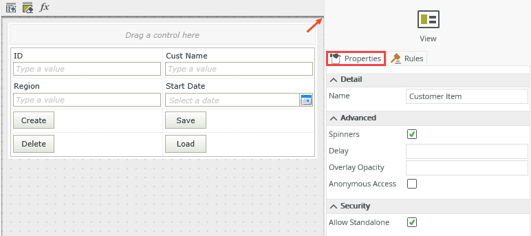 When you design a view, you can configure the properties of that view. Click the outline of the view in the designer to open the properties on the right.