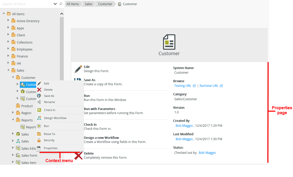 Right-clicking an existing form allows you to perform actions on the form, such as Edit, Rename, Save As, and Delete. You can also see these actions by selecting a form and using actions on the form properties page, both of which are shown here.