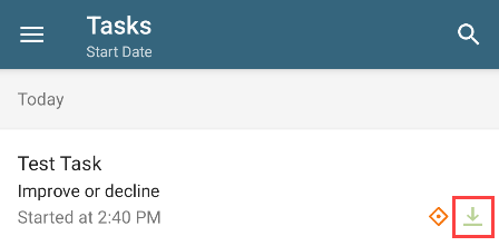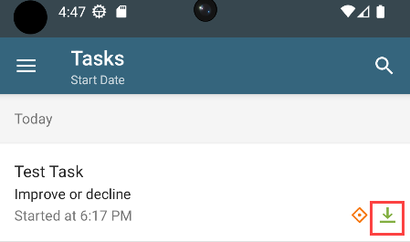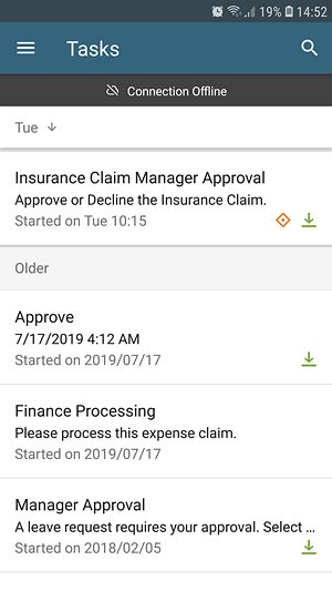 - If a workflow task contains a form and the form is marked for offline availability, the task shows a light green download icon on the mobile device, indicating the form can be downloaded for offline use. The light green color shows that the form has not been downloaded yet.