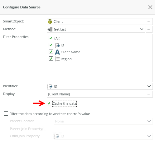 When you enable the Cache the data setting of a list control, data is downloaded and cached when the Workspace (Mobile) app is online and the form initializes. This means that you must load all the data you need during initialization by checking the Cache the data check box of the control's data source. See Client side filtering, How caching is applied and How caching is applied with cascading data.