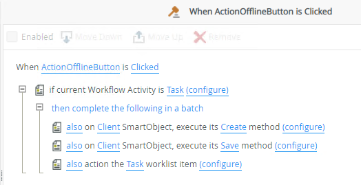 - Batch rule actions together using the complete the following in a batch execution type because only one call is made to the server when you use offline forms. It is recommended that you have one action button and the rule for this button must contain all actions that you want to record when offline. SmartObject method actions and workflow-related methods are examples of actions that must be recorded while offline.