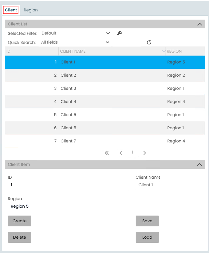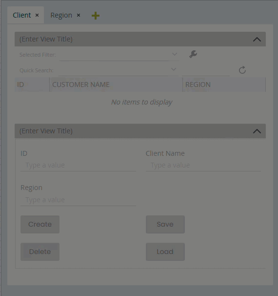 Form tabs allow you to present large amounts of data or gather input without designing a long and complex form. Each tab typically displays one or more views with additional controls on the tabs as needed. Tabs allows you to display different sections of the same form and do not contain any logic in themselves. You can use rules to conditionally show or hide tabs which is useful in more complex input scenarios. For example, you may, depending on some condition, need to show views to gather additional information. The examples below show the Client and Region tabs of the Client form.