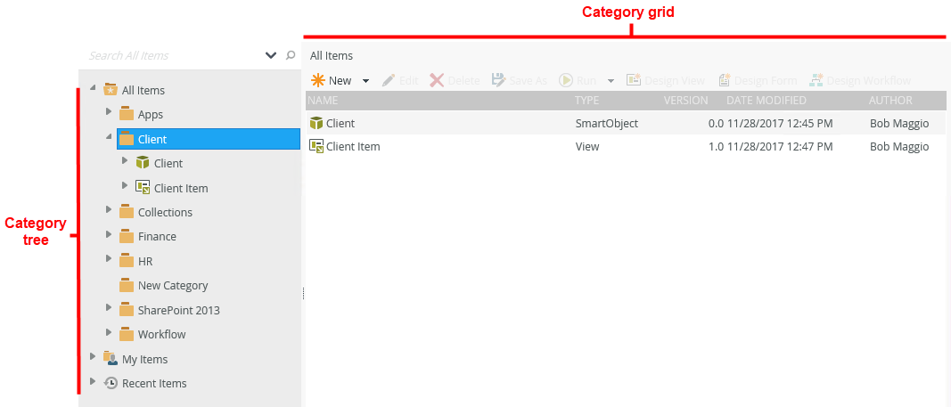 The Category system is similar to a folder tree and gives you access to your objects such as SmartObjects, views, forms, workflows, style profiles and hyperlinks. You can create additional folders and subfolders to structure your category tree. You can also create and edit SmartObjects, views, forms, workflows, and style profiles directly from the tree, and search and filter the tree from this page.