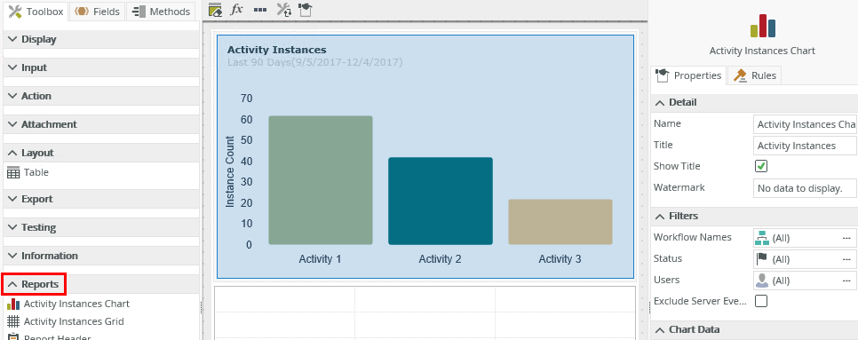 | Display Value | This shows how the data is aggregated in the chart. You can select to show the data in duration (how long the activity took to complete) or instance count (the amount of instances per activity). | Yes, see Configure the Set a Control's Properties Action for more information. |