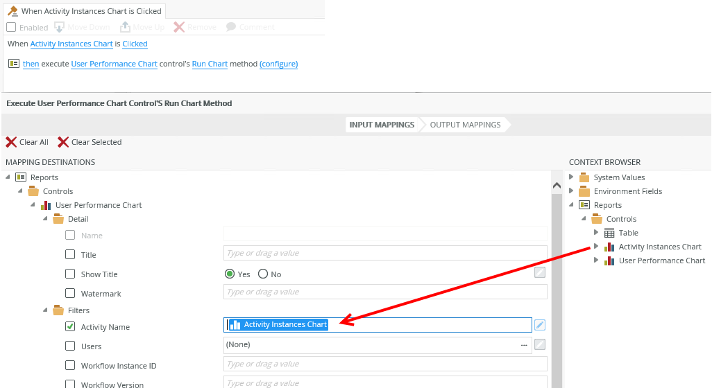 Configuration: Map the Activity Instances Chart to the Activity Name filter of the User Performance Chart