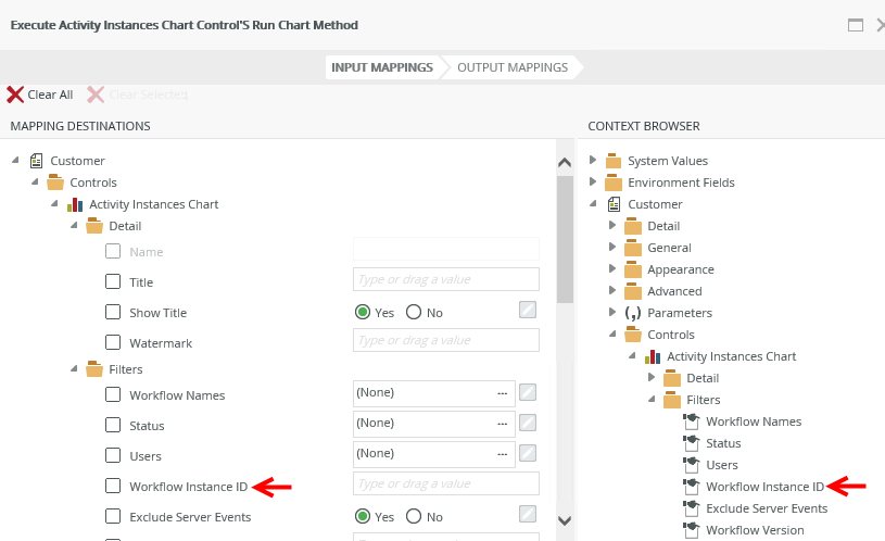 | Workflow Names | This is the workflow on which you want to filter the data. If you select All, all activity instances of all workflows are shown. Click the ellipsis to use the Workflows Picker. You can add more than one workflow to the list. The default setting is All. | Yes, see Configure the Set a Control's Properties Action for more information. |