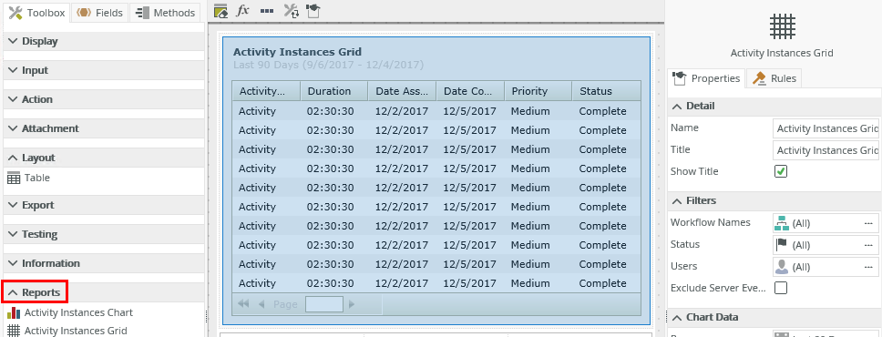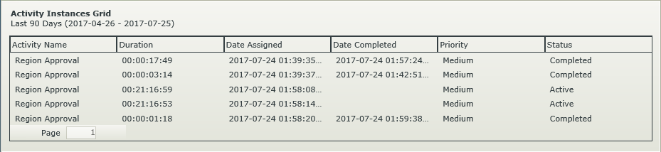 The Activity Instances Grid control lists all activity instances of a workflow according to filter criteria, and is displayed as detailed information of an activity instance or instances. You can use the grid to:
