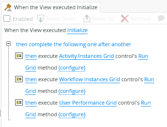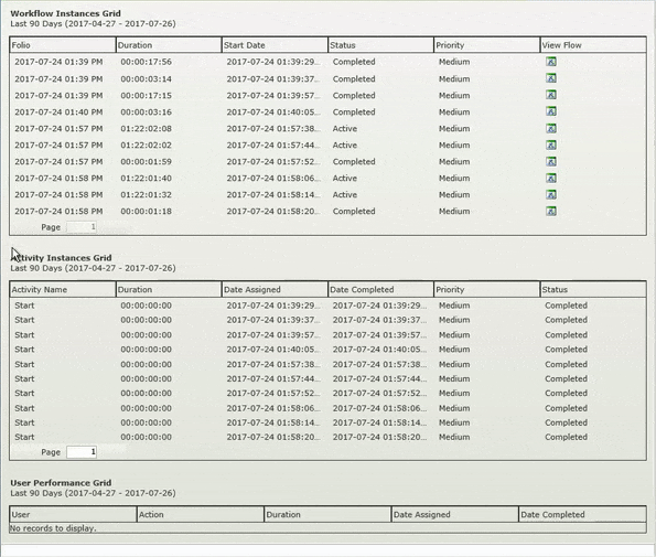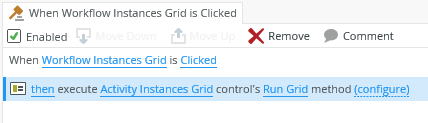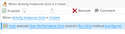 - You can, for example, use the Workflow Instances Grid to filter the Activity Instances Grid and User Performance Grid. This allows you to click an activity on the Workflow Instances Grid, the Activity Instances Grid is updated to show only activities for the selected workflow instance. In turn, when you click a filtered activity on the Activity Instances Grid, the User Performance Grid is updated to show users who have completed that specific activity of the workflow instance. Create and configure the following rules for this scenario:
