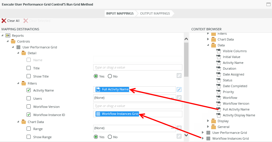 Configuration: Map the Workflow Instances Grid to the Workflow Instance ID of the User Performance Grid and the Full Activity Name of the Activity Instances Grid to the Activity Name of the User Performance Grid