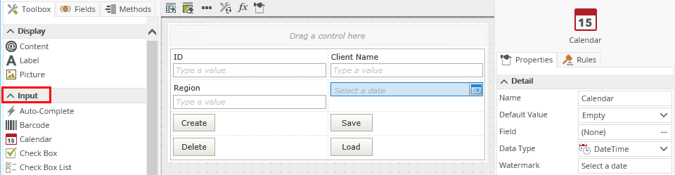 - Drag the control onto the canvas. You can find the control in the Input section of the Toolbox.