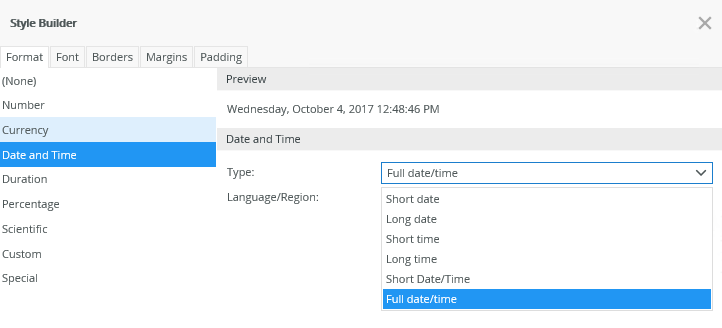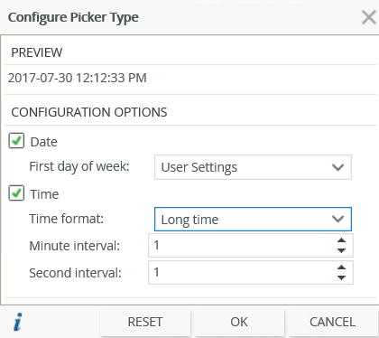 - When you apply a Date and Time format using the Format property, it is important to keep the format in sync with the settings of the Picker Type property to ensure correct expected behavior. For example, when you use Full date/time format on the Format page and you select the Time option in the Picker Type property, the value displays in Full date/time format, but when you click on the Calendar picker, you can only edit the time
