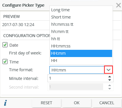 - When you select Date and Time or Time in the Picker Type property, the Time value in the picker shows either a 12-hour or 24-hour clock picker depending on the culture settings