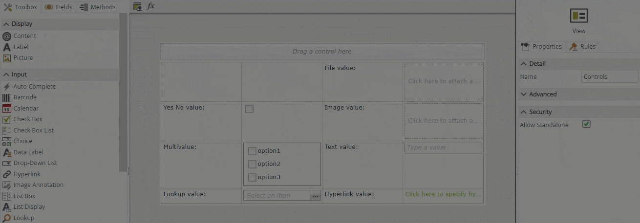 You can use controls on views and forms to display or capture data, and to interact with the view or form, such as executing a rule when a control is clicked. Use controls to perform actions such as add attachments, type text, select an item from a drop-down list or display a URL. You can also use button controls to execute rules that you create in the Rule Designer. For example when you click a button, then open another view or form, save data to one or more SmartObjects, or save a screenshot to PDF.