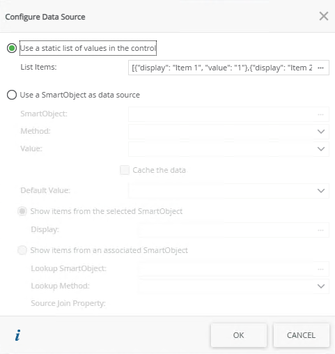 When you click on the ellipsis next to Data Source Type in the control's properties, the Configure Data Source page opens. You can use a SmartObject or a static list of values.