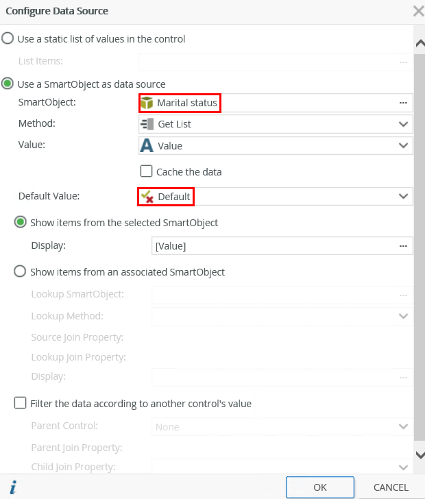 - Click the ellipsis next to Type in the Data Source section of the control's Properties, and then select the Marital Status SmartObject as the data source for the control and the Default property in the Default Value field.