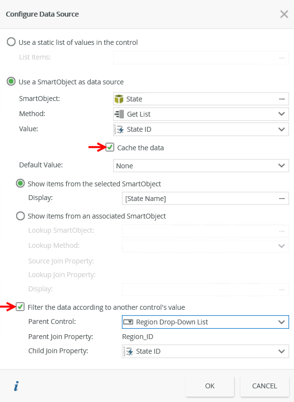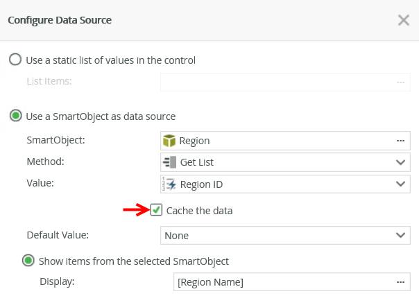 You have the option to cache the SmartObject data to enable client-side filtering. This is especially useful when you use a form on a mobile device and you need the data to be available if the device is offline. The control's data set is populated on initial load (from the server), any other changes to the underlying data source's data does not reflect in the current session until another server call is forced to update the data set. To enable the caching of data, select the Cache the data option on the Configure Data Source page.