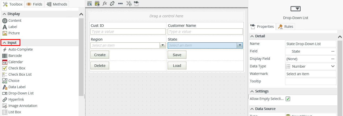 - Drag the control onto the canvas. You can find the control in the Input section of the Toolbox.