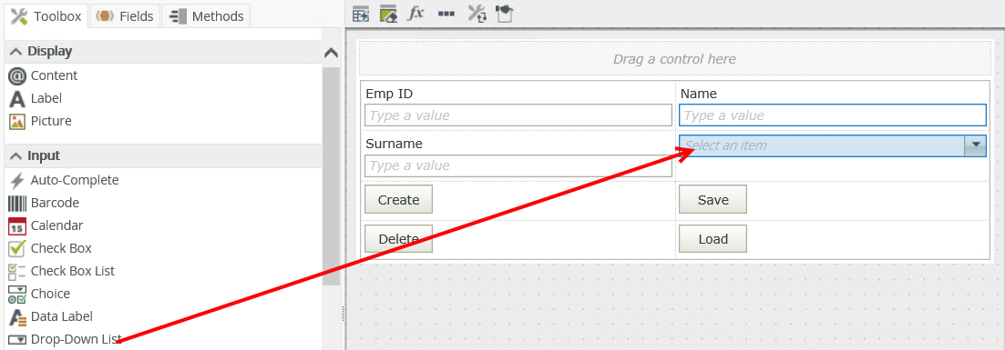 - Edit the view and drag a Drop-Down List control onto the canvas.