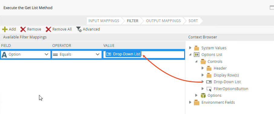 - When you add the control to a List view for filtering purposes, especially when using the same data source as the view, be sure to map the control when you configure the filter as shown below. You do this to keep the correct data source context and enable the filtering to execute correctly.