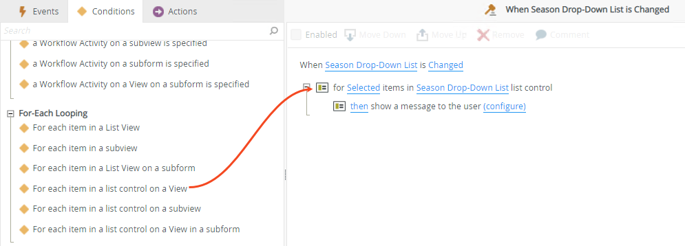 - If you use the Value or Display fields in a rule you must add a For-Each Looping condition to your rule to ensure that a loop context is built to retrieve the selected item values. Using the seasons example from the images above, you may want to show a message to the user when they select an item to inform them that the value saved to the SmartObject differs from the display value (which they select) if they want to use it at a later stage. In this scenario, the rule is configured as per the images shown below.