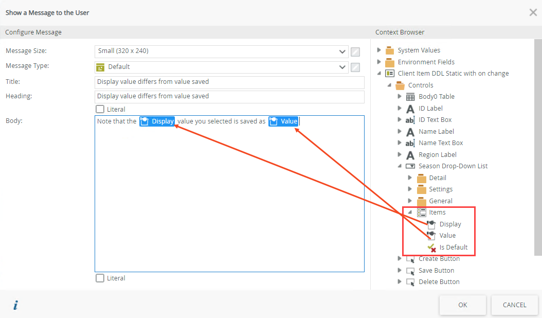 Message using the Display and Value fields of the static drop-down list