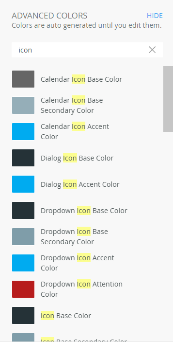 You can use variables in the Advanced section of the Style Profile Designer to apply styles to your control's icons. Search for these by typing "icon" as shown below. This styling is limited to the Dynamic theme.
