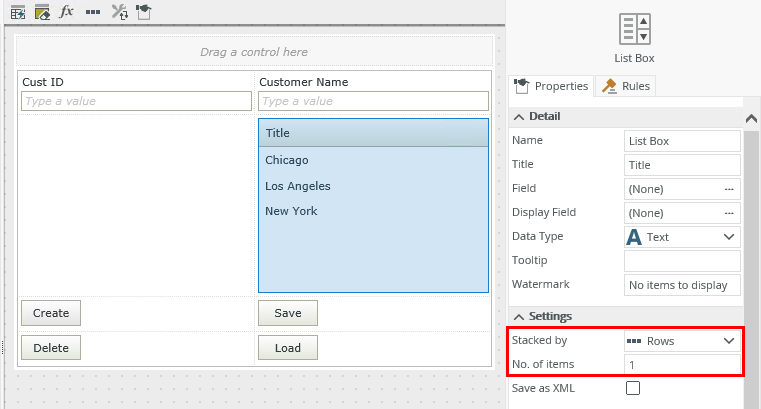 | Stacked by | Specify how to display the items. You can choose between rows and columns. The property defaults to rows. See the List Box control items per row or column section for more information. | Yes, see Configure the Set a Control's Properties Action for more information. |