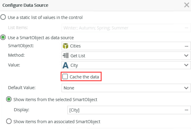 You have the option to cache the SmartObject data to enable client-side filtering. This is especially useful when you use a form on a mobile device and you need the data to be available if the device is offline. The control's data set is populated on initial load (from the server) any other changes to the underlying data source's data does not reflect in the current session until another server call is forced to update the data set. To enable the caching of data, select the Cache the data option on the Configure Data Source page.
