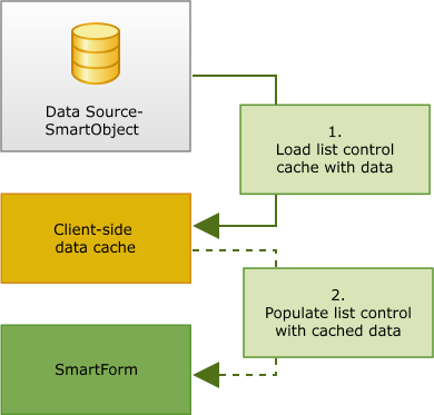 When you access a form on a mobile device, the view initializes and the rule action to Load list control cache with data executes as shown in point 1. Next, the rule action to populate list control with cached data executes as indicated in point 2. You can select updated data from the list on the form. When the device goes offline, you can still access the information in the list.