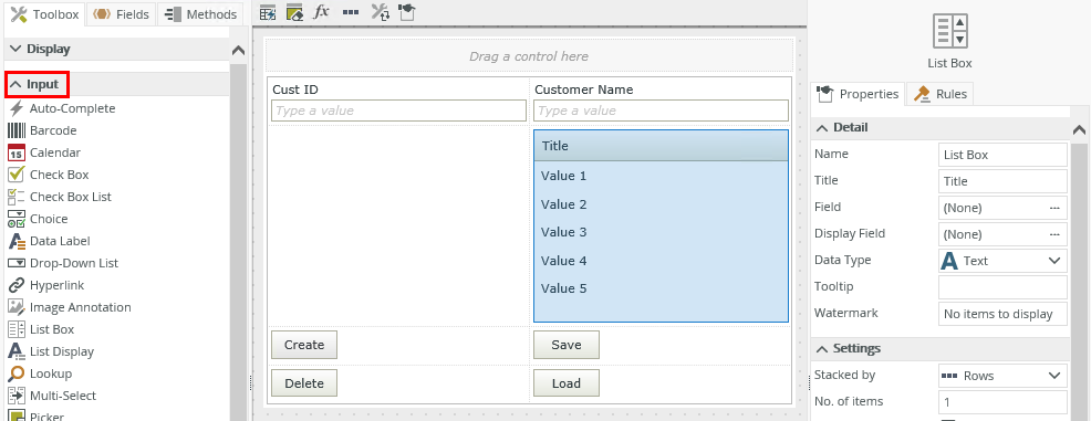 - Drag the control onto the canvas. You can find the control in the Input section of the Toolbox.