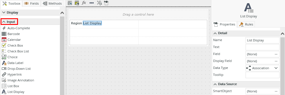 - Drag a List Display control onto the canvas and add a data source to the control. Select the Region SmartObject.