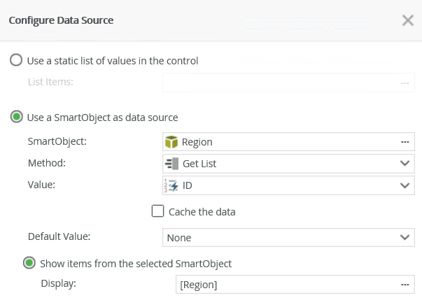 | SmartObject | Select the SmartObject that you want to use to populate the control. Click the ellipsis next to SmartObject to select one. |