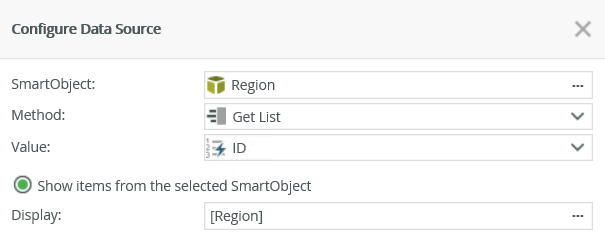 - Add a data source to the drop-down list. To do this, configure the Type under the Data Source of the Properties section. Select the Region SmartObject.