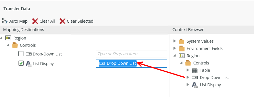 - Configure the action as shown. Map the Drop-Down List control to the List Display.