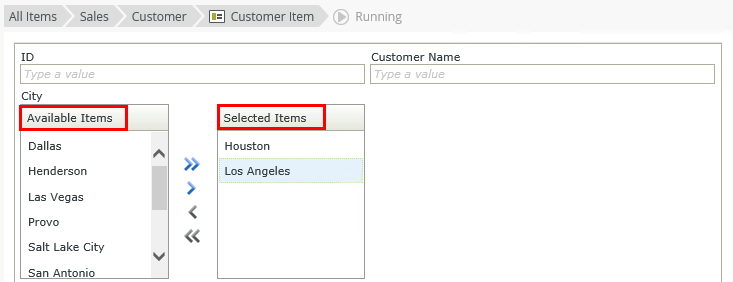The Multi-Select control allows you to select one or more items from a list of values by moving items between two list boxes. Add a single item to the Selected Items list box by selecting the item from the Available Items list box and clicking on the arrow icon . Add multiple items by holding down the control (CTRL) key on your keyboard, click each item from the list, and then click the arrow icon.