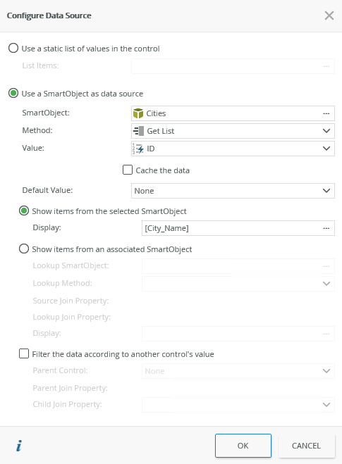 | Use a SmartObject as data source | Select this option if you want to use a SmartObject as the data source. |