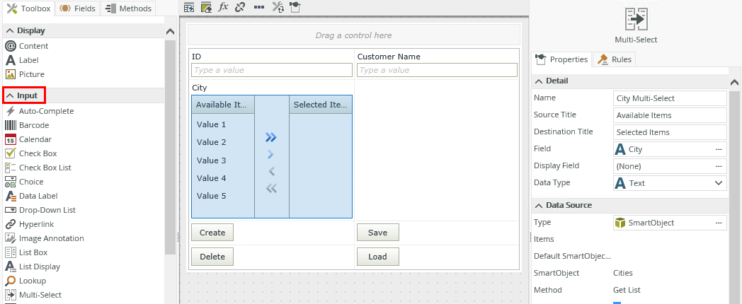 - Populate a list control with data: You can populate the control if its data source is a SmartObject